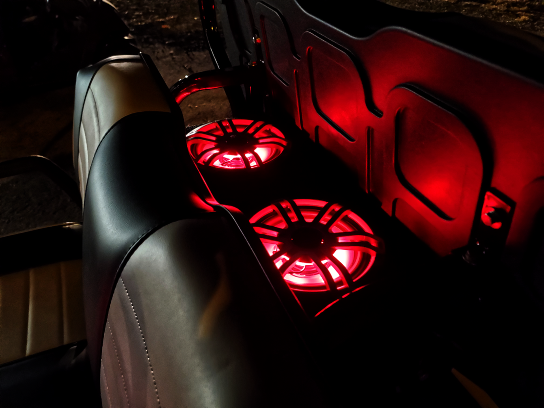 A 150-watt Memphis MX150.2 marine amplifier powers four Hertz HEX 6.5” marine speakers — two in the dash and two mounted behind you in our BA Rear Speaker Box, which bolts directly to the frame. With sound firing forward, upward, and reflecting off the roof, the GLD4 fills the entire cart with clean, balanced audio that front and rear passengers hear equally well.