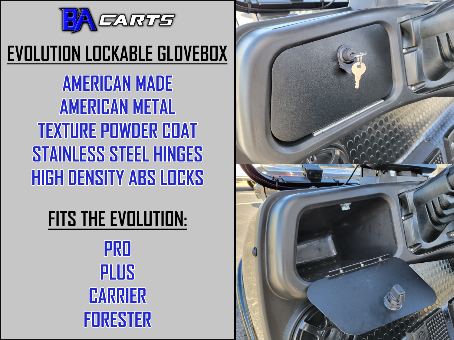 Everything is built from real materials — steel doors, stainless piano hinge, stainless hardware — so nothing rusts, flexes, or falls apart like the cheap overseas plastic kits. It installs clean, looks factory, and keeps your valuables protected whether you’re at the campground, course, or marina.