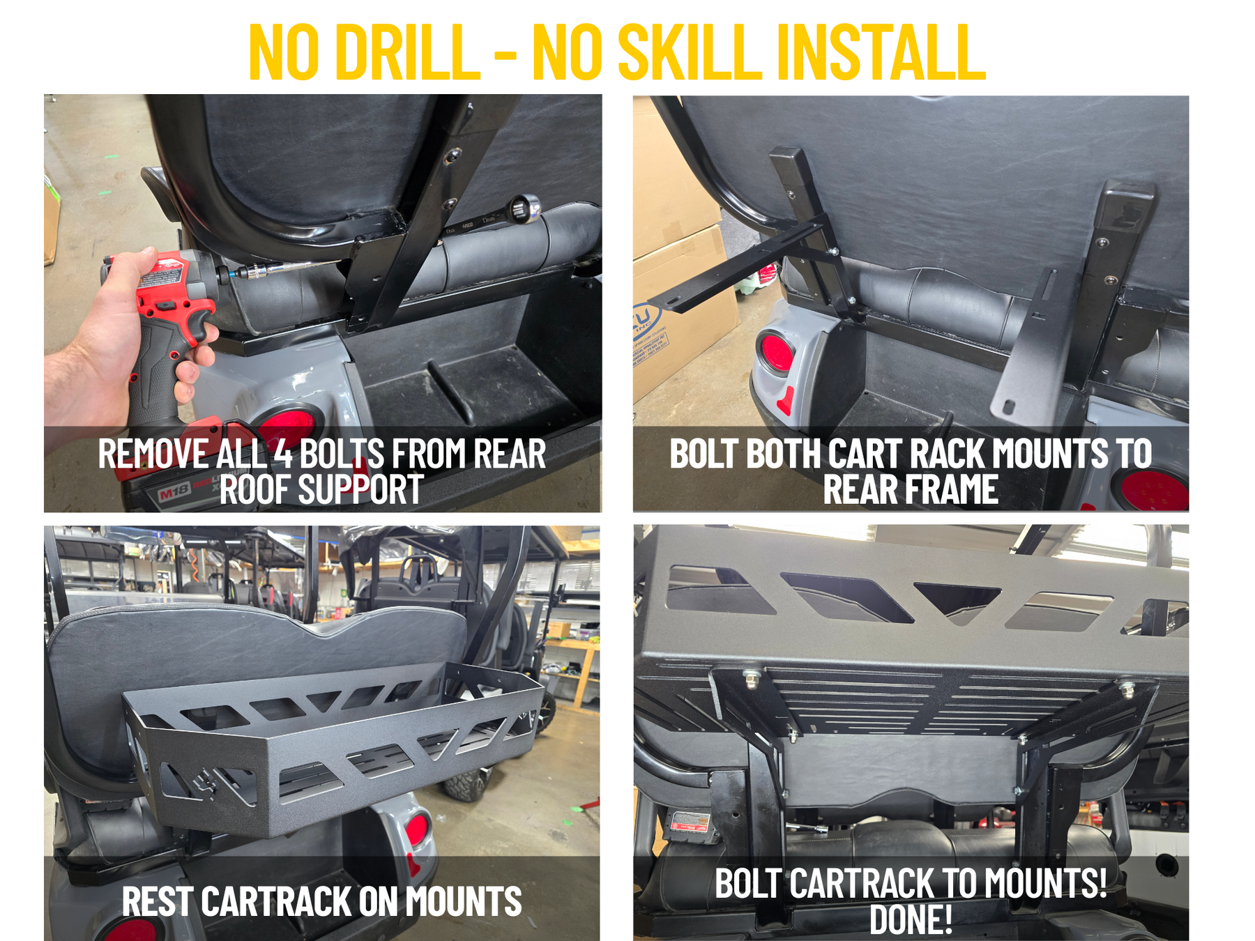 No Drilling. No Cutting. The CartRack™ mounts to your EZGO Liberty using included proprietary hardware and existing mounting points. Install it with basic hand tools in minutes and enjoy a factory-clean fit every time.