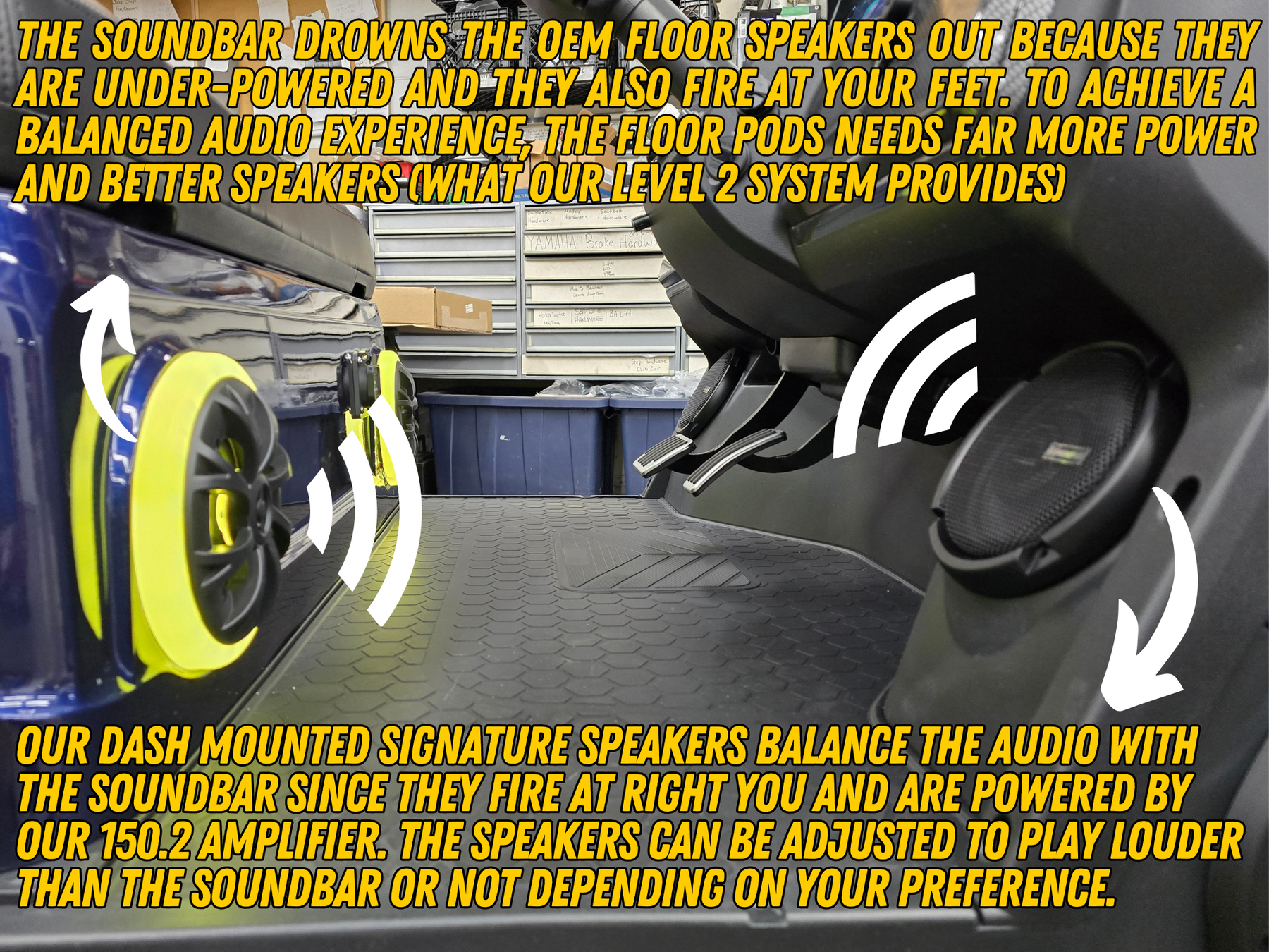 If you own a D5 Plus and want better audio, this is the system for you. The Level 1 Audio System fixes the biggest frustrations D5 Plus owners face. The soundbar? No longer the only speaker you hear. The weak factory floor speakers? Reinforced with our Signature BA Memphis Dash Speakers that bring balance and clarity to your sound. Adjusting the volume? Made simple with an included volume control knob—no more tapping tiny touchscreen buttons while trying to enjoy your ride.
