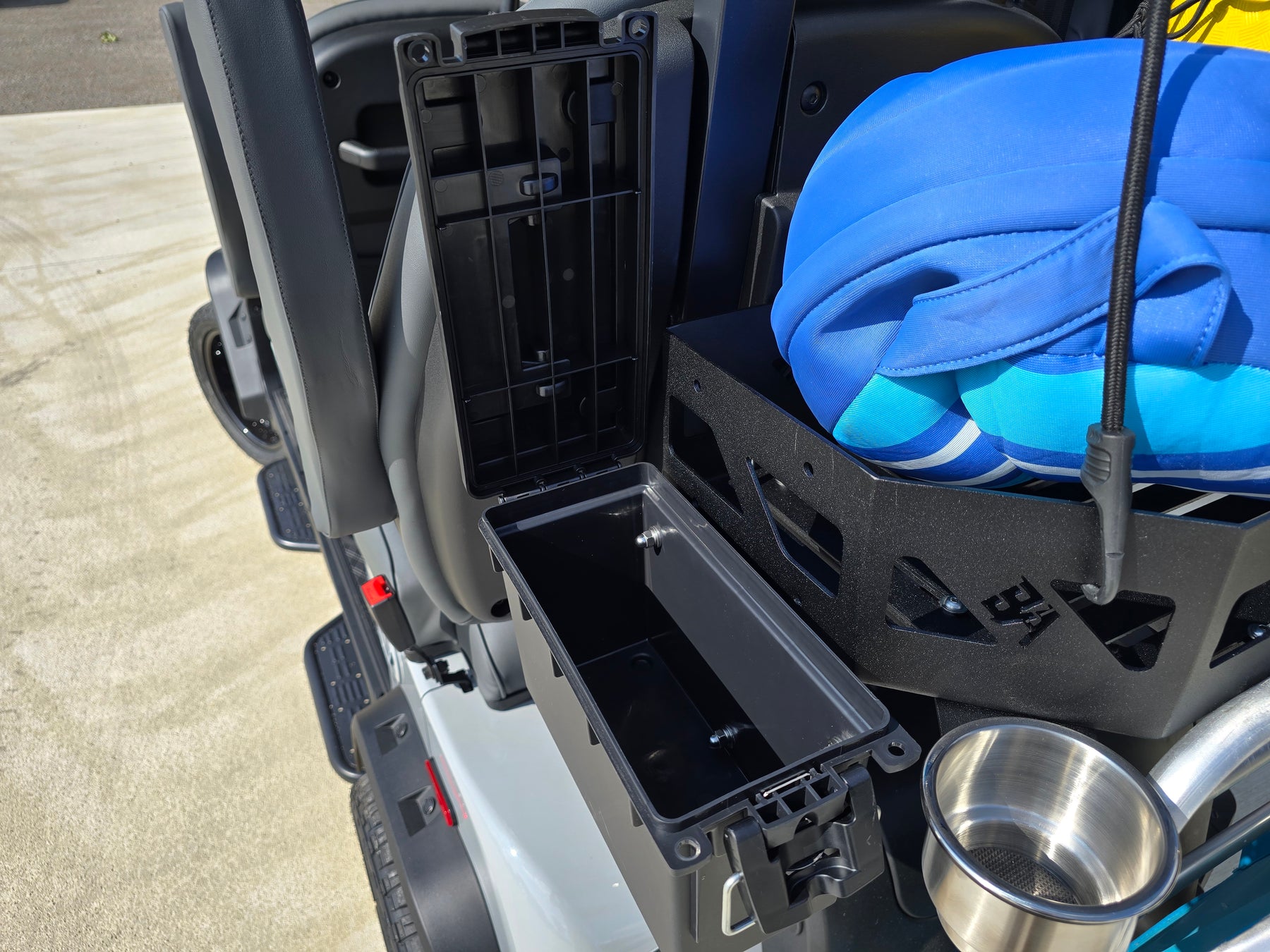 The inside of the lid features a rubber gasket to keep moisture out, and a sturdy metal tab allows you to slide in a padlock (not included), locking the clamp shut and keeping out would-be thieves. Let’s be real—most golf carts offer zero real security. Plastic glove boxes with plastic latches don’t cut it. The Lockable DryBox offers a smarter option: actual protection for your valuables, in a form that doesn’t stick out like a sore thumb.