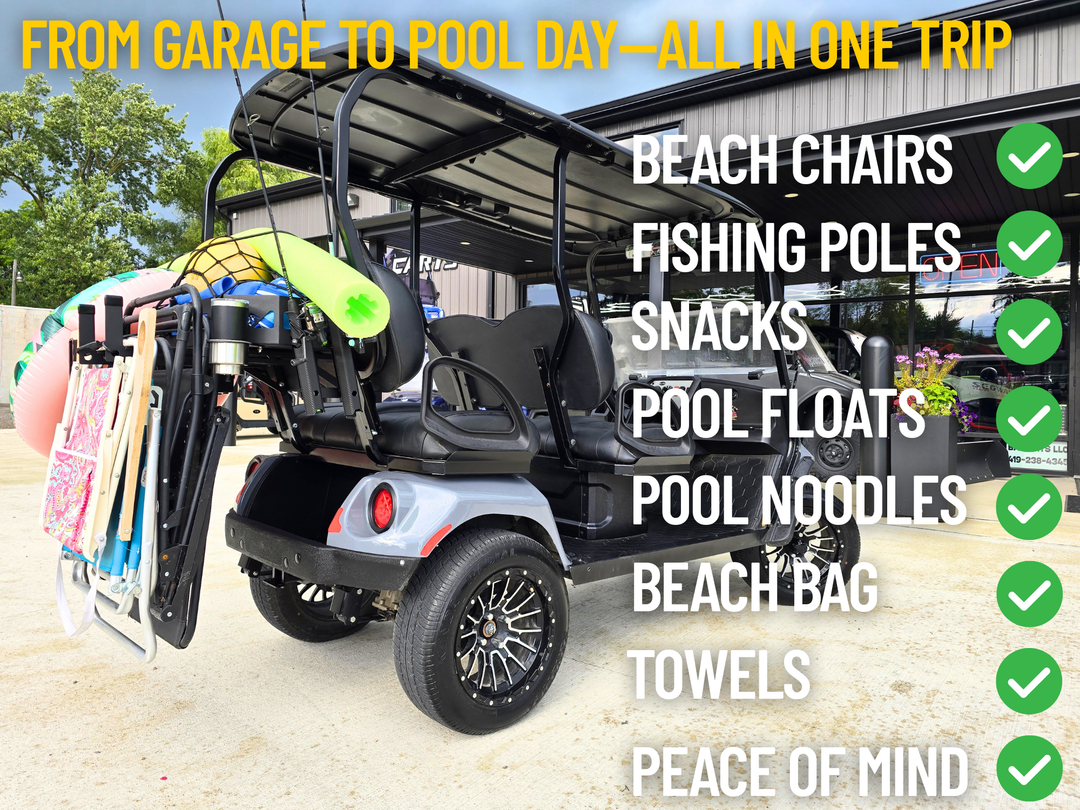 The Adventurer Loadout gives you every attachment we make—built for the cart owner who refuses to half-send it. Chairs, rods, tools, towels, drinks, gear… if you can haul it, this setup can handle it.