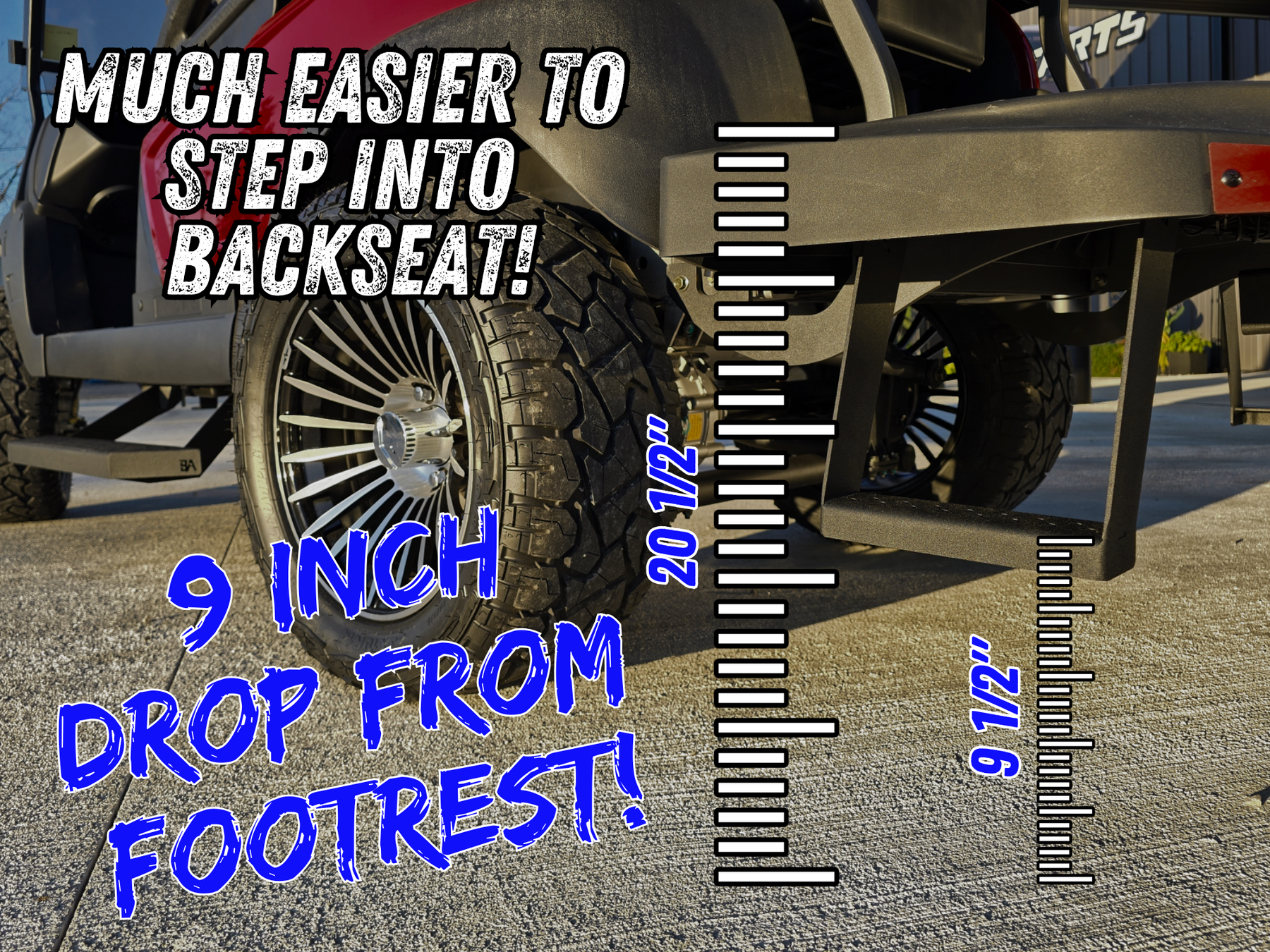Lifted Atlas carts look great, but that rear footrest sits way higher than most people expect. Kids struggle. Grandparents hesitate. It’s just too tall.