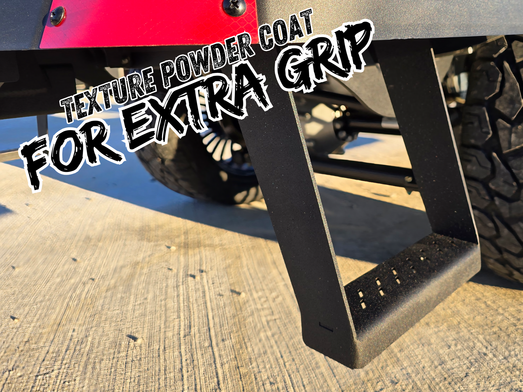 Our textured powder coat and slotted step surface give you serious traction—rain, mud, wet grass, whatever. No slip, no slide, no problem.