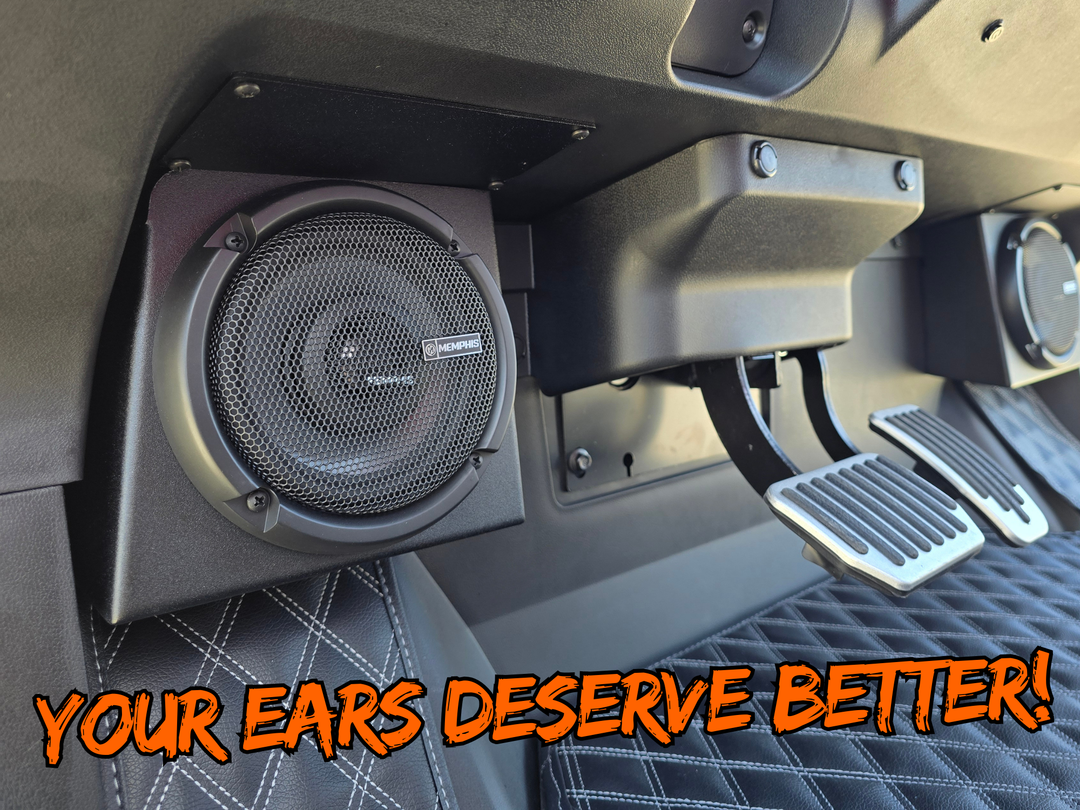 • Custom-Fitted Speaker Enclosures – Unlike factory speakers that fire at the floor, these enclosures direct sound toward you for a more immersive experience.