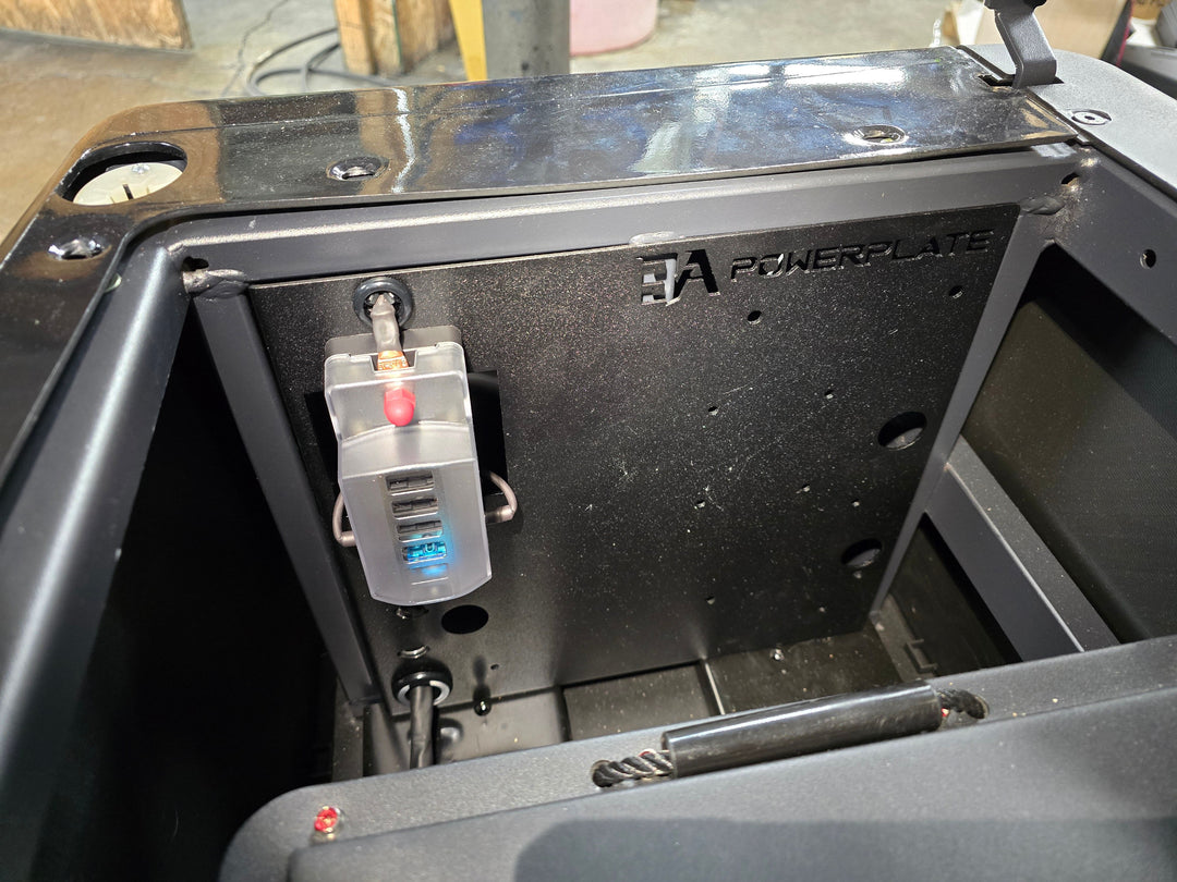 The PowerPlate mounts to pre-existing holes under the rear seat and plugs directly into the 12-volt converter, so you don’t need to modify your cart.