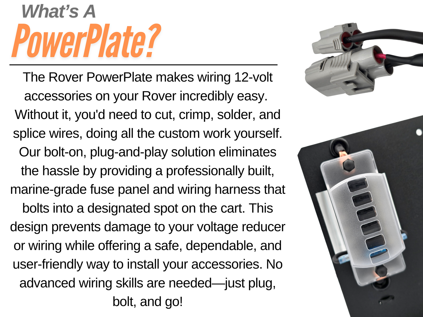Don’t want to cut into your Rover’s wiring? The Rover PowerPlate™ is a plug-and-play solution that bolts on and taps directly into the factory 48V–12V converter. It features a marine-grade fuse panel for clean, safe power—no cutting, crimping, or soldering required. Add lights, amps, and accessories in minutes without touching a single wire.